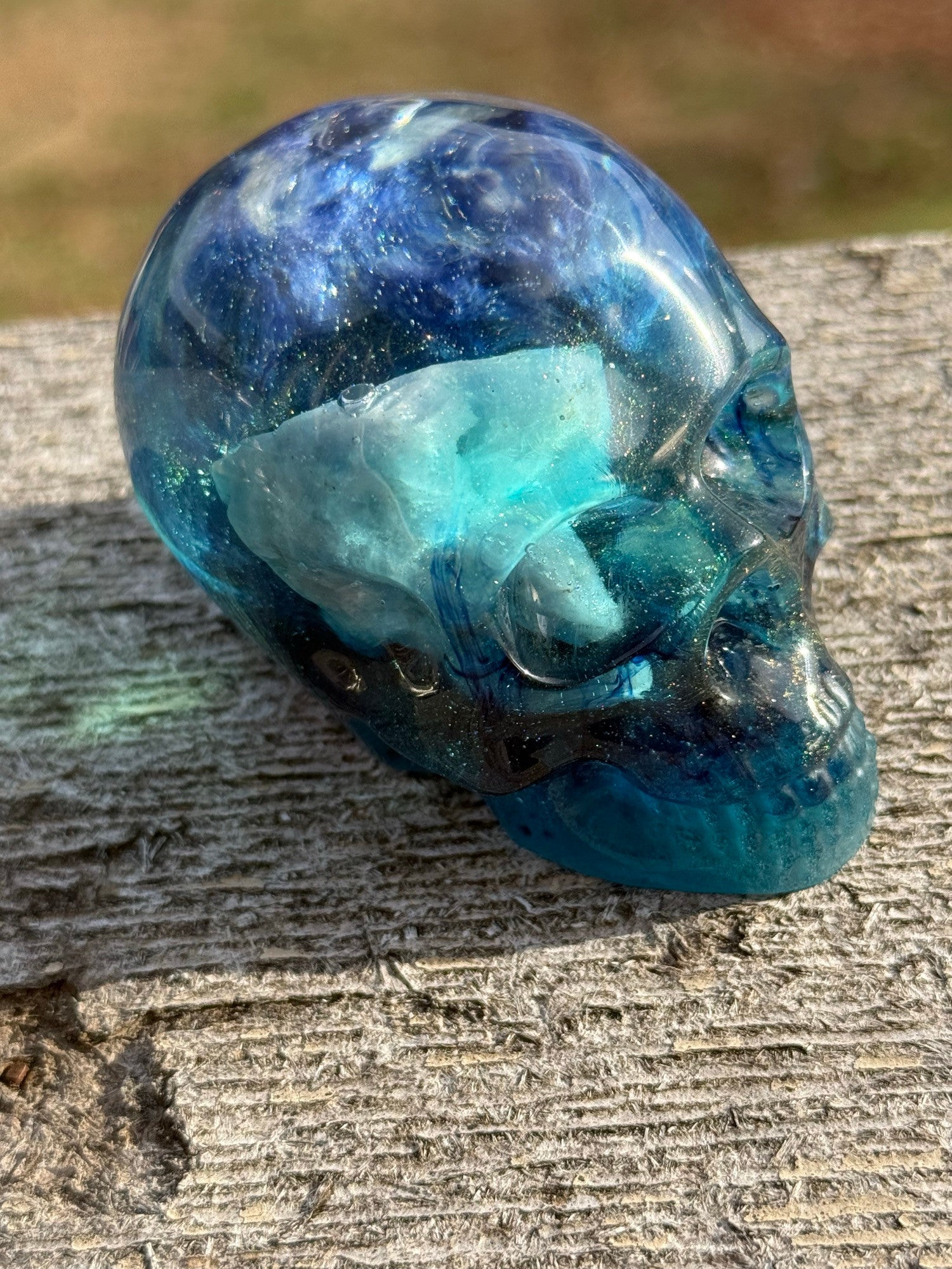 Small blue resin-cast skull containing blue minerals and crystals.